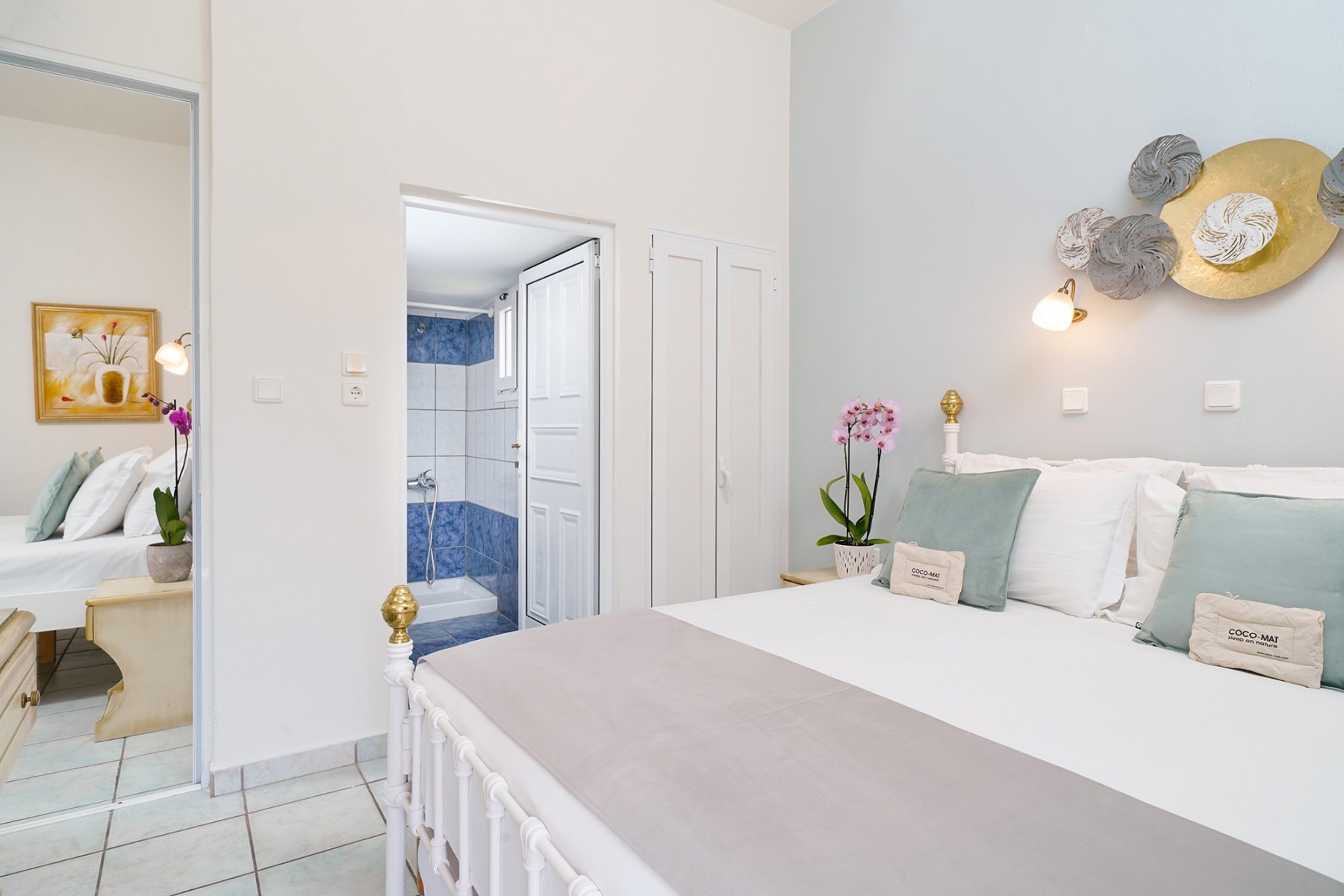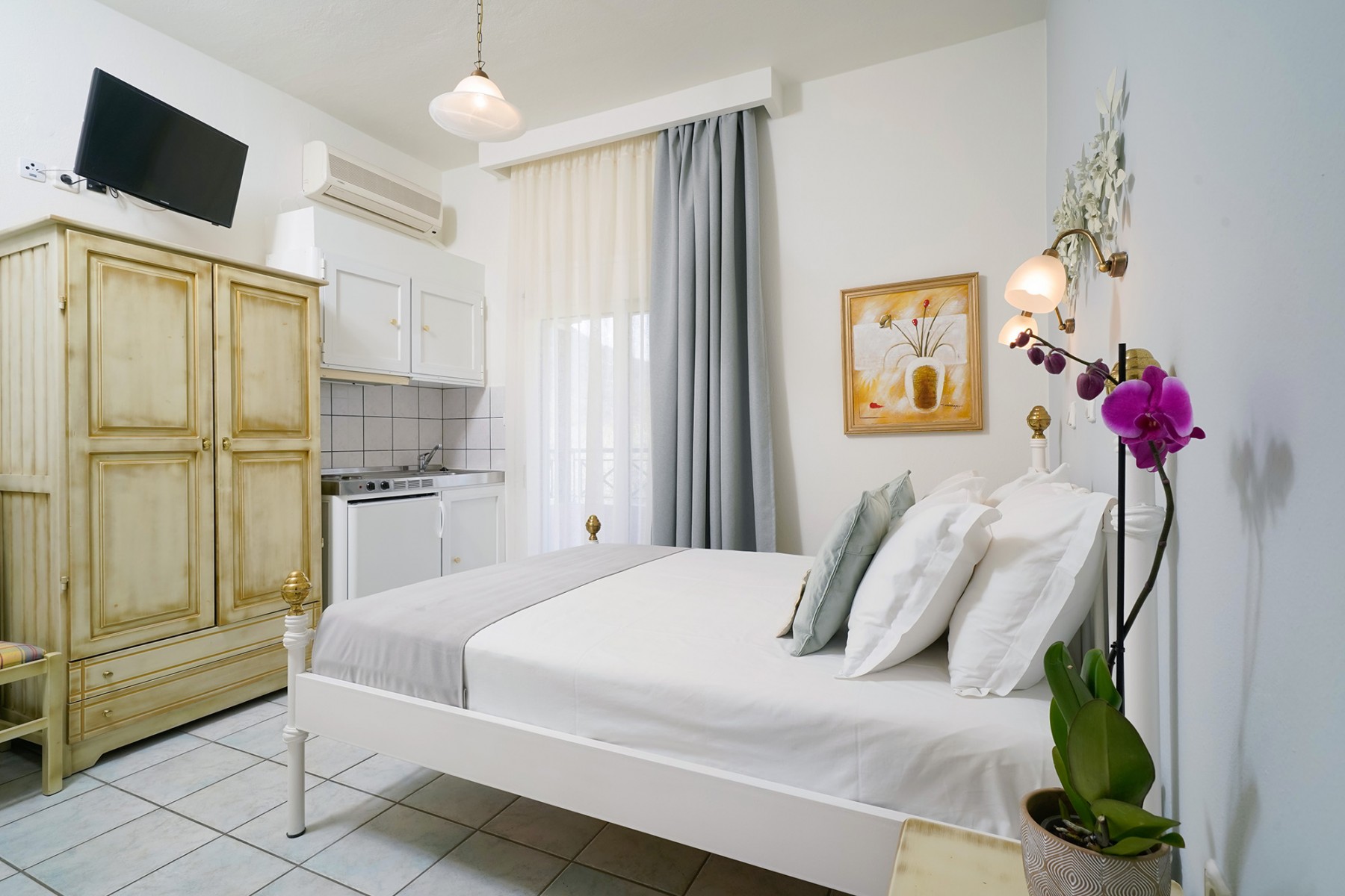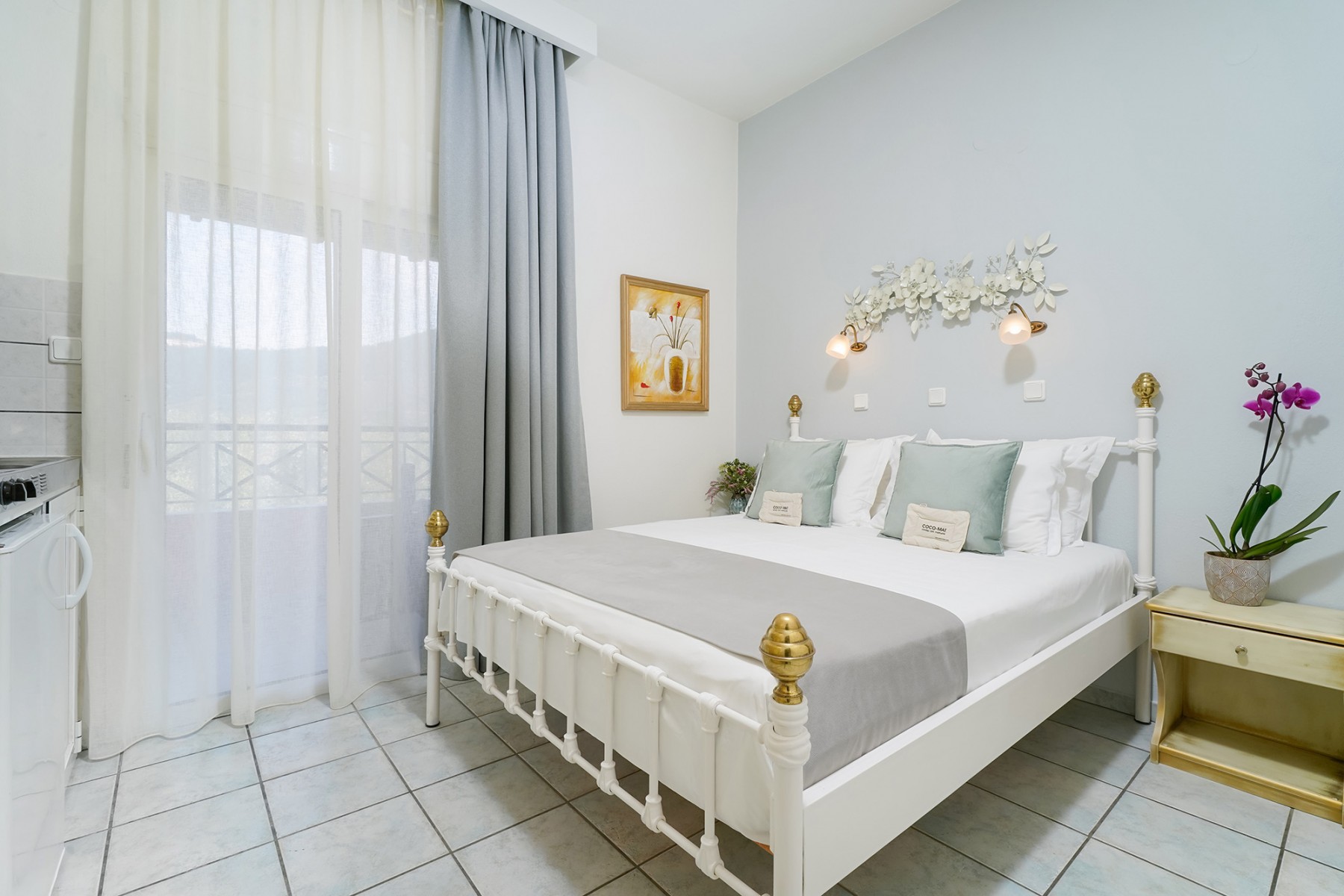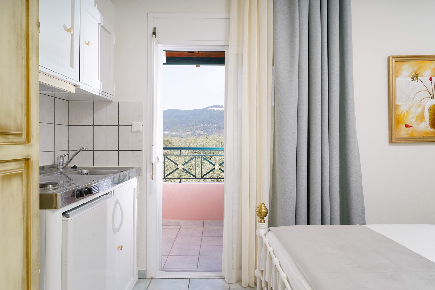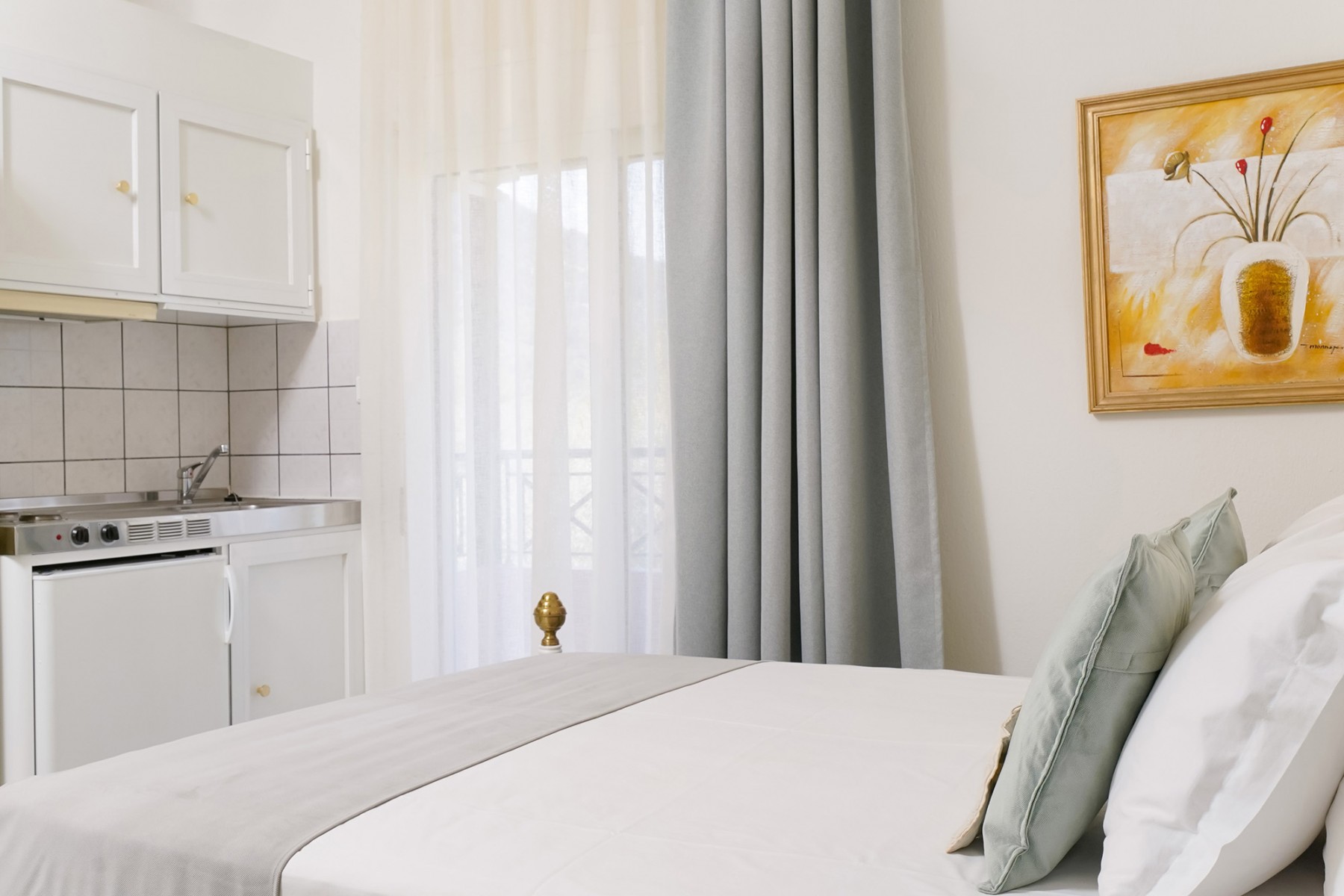 These apartments have two spacious rooms, the first room has the kitchenette, wardrobe, dressing table and a double bed. The second room also has a double bed, wardrobes and dressing table and from here you will find the separate bathroom with shower, wc and hand basin. Both rooms have patio doors onto the furnished balcony.