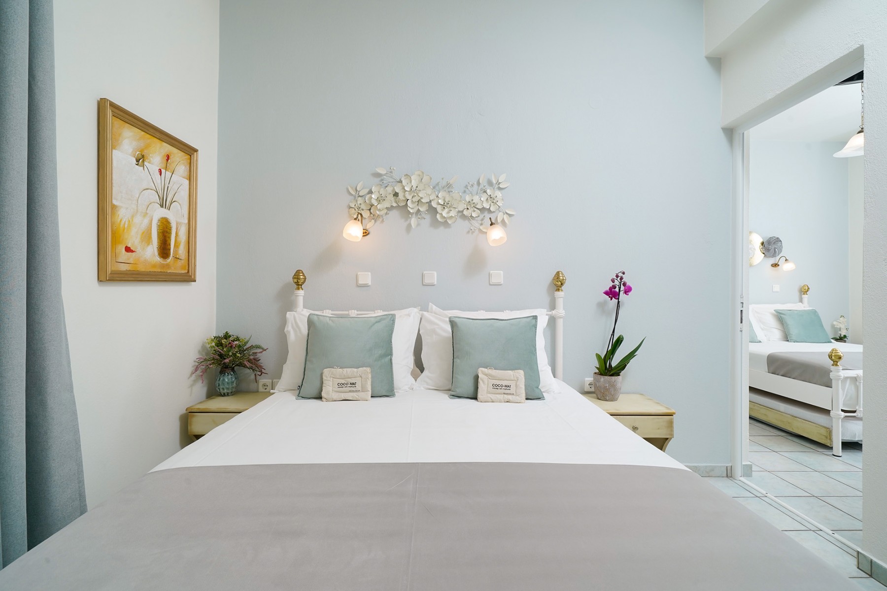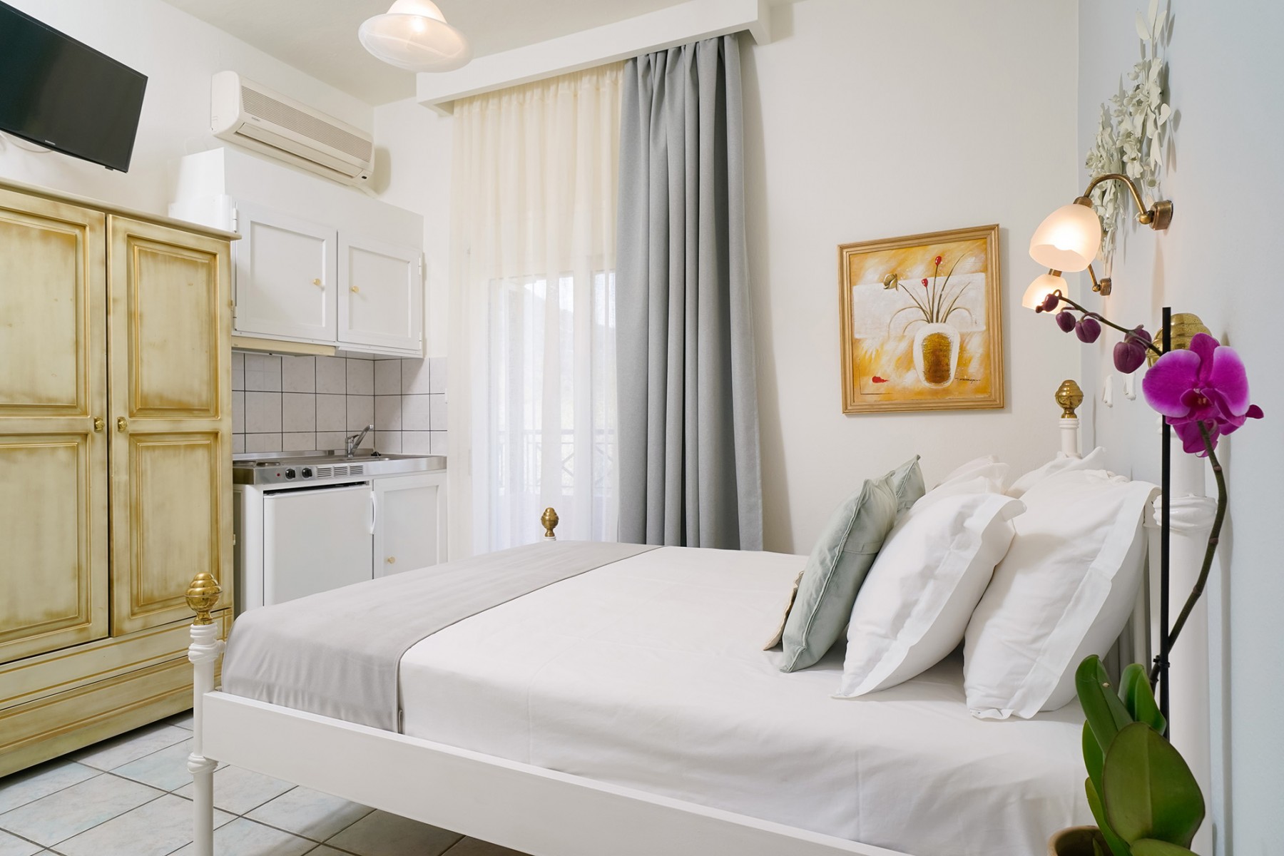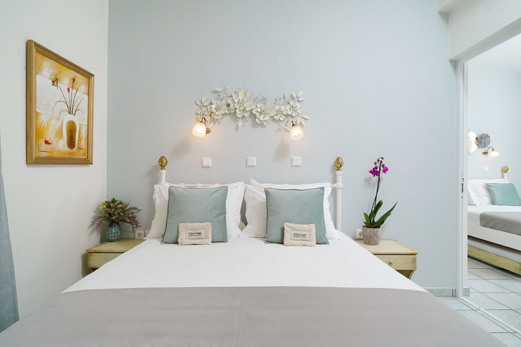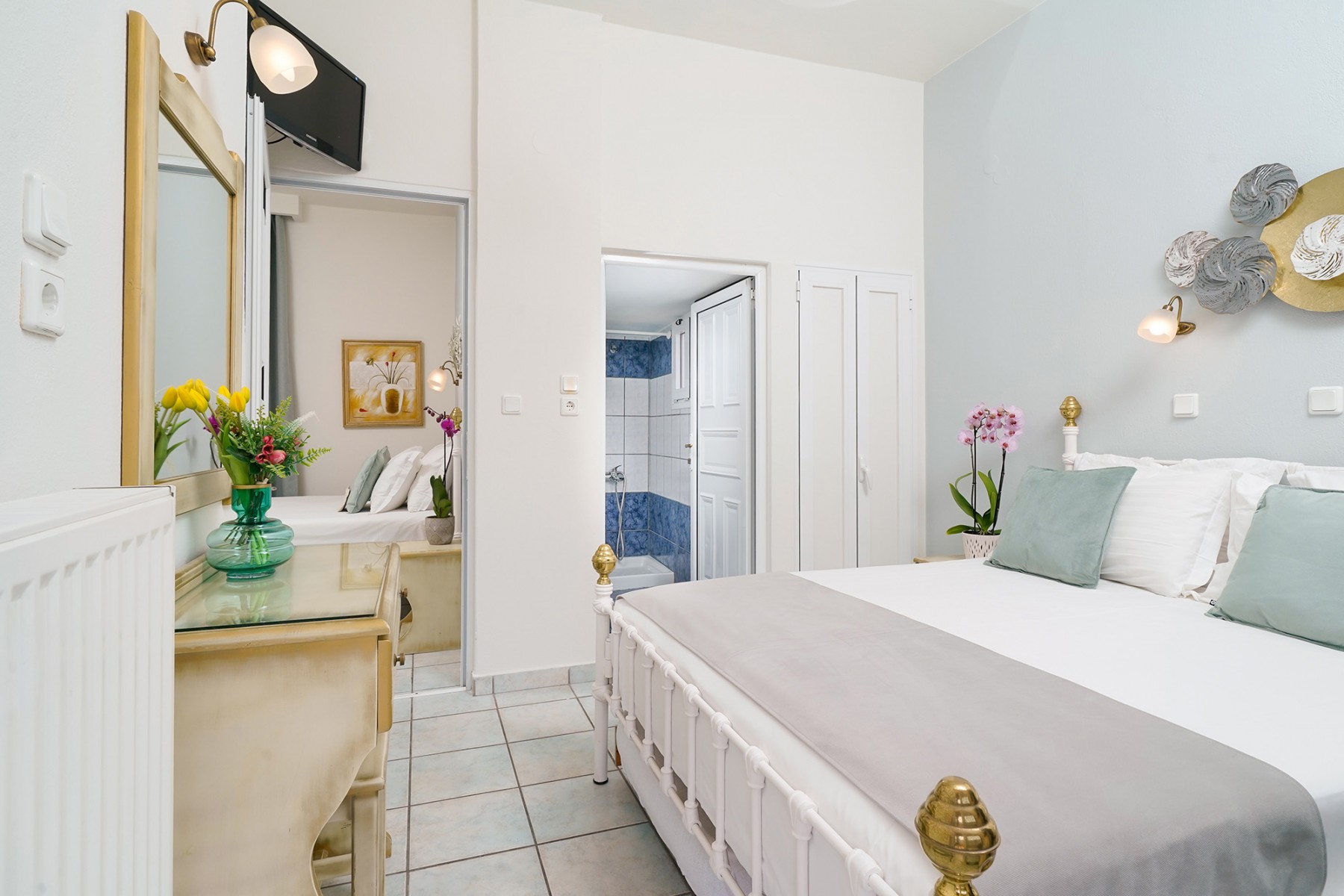 These apartments have two spacious rooms, the first room has the kitchenette, wardrobe, dressing table and a double bed. The second room also has a double bed, wardrobes and dressing table and from here you will find the separate bathroom with shower, wc and hand basin. Both rooms have patio doors onto the furnished balcony.