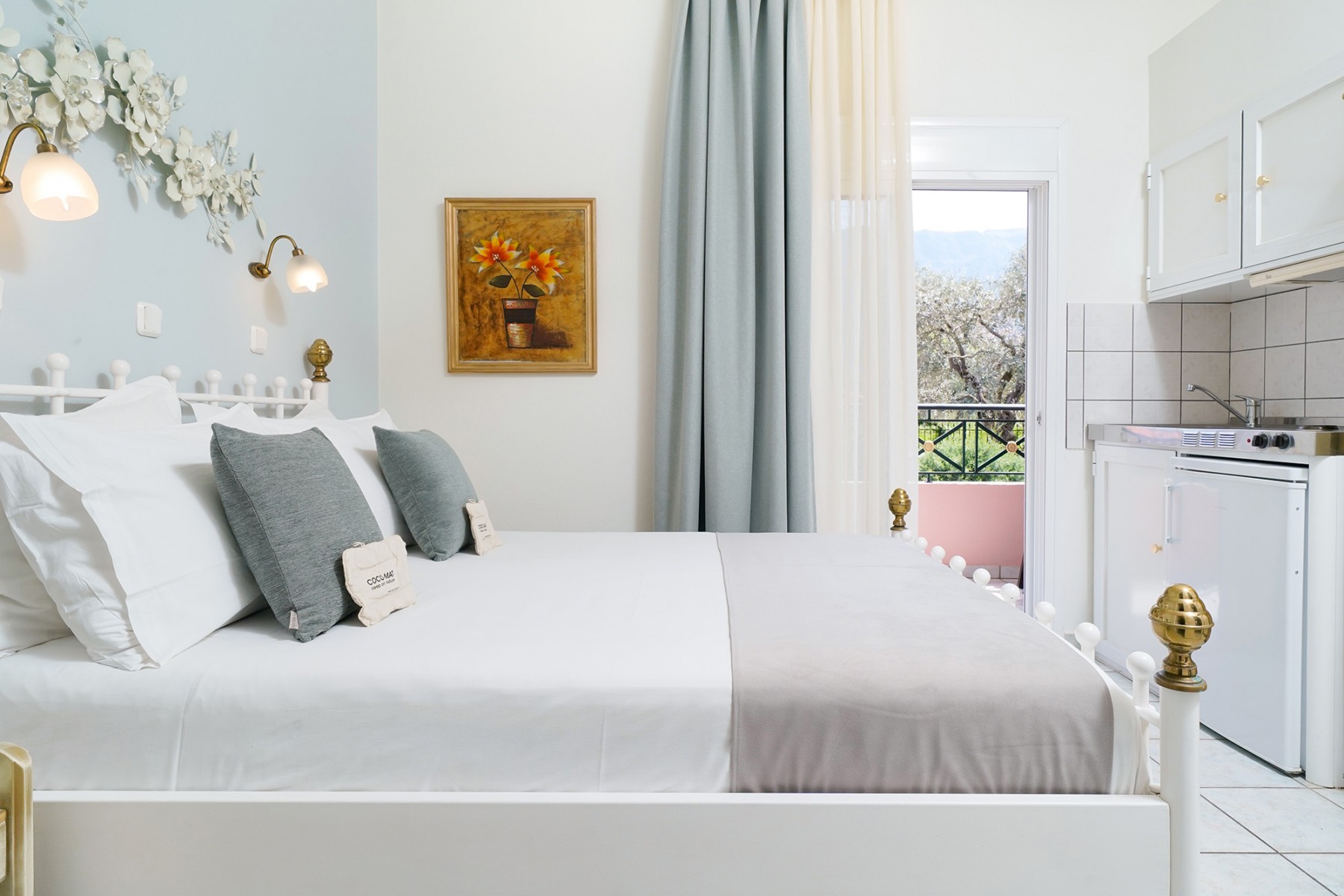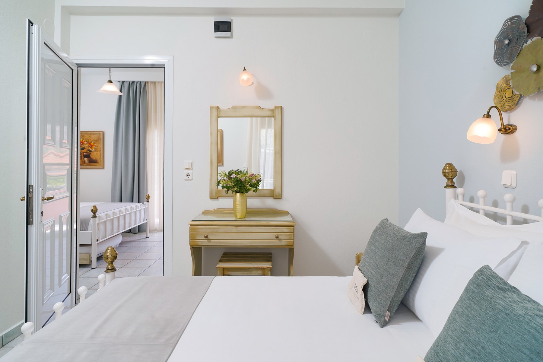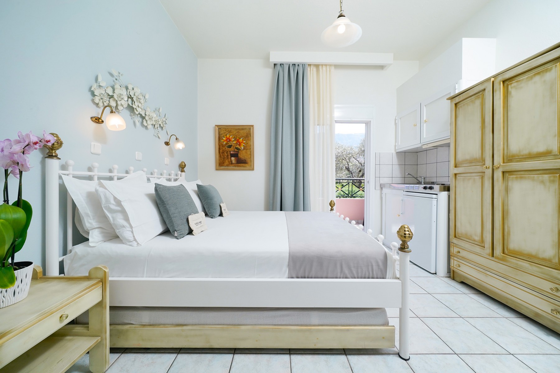 These apartments have two spacious rooms, the first room has the kitchenette, wardrobe, dressing table and a double bed. The second room also has a double bed, wardrobes and dressing table and from here you will find the separate bathroom with shower, wc and hand basin. Both rooms have patio doors onto the furnished balcony.