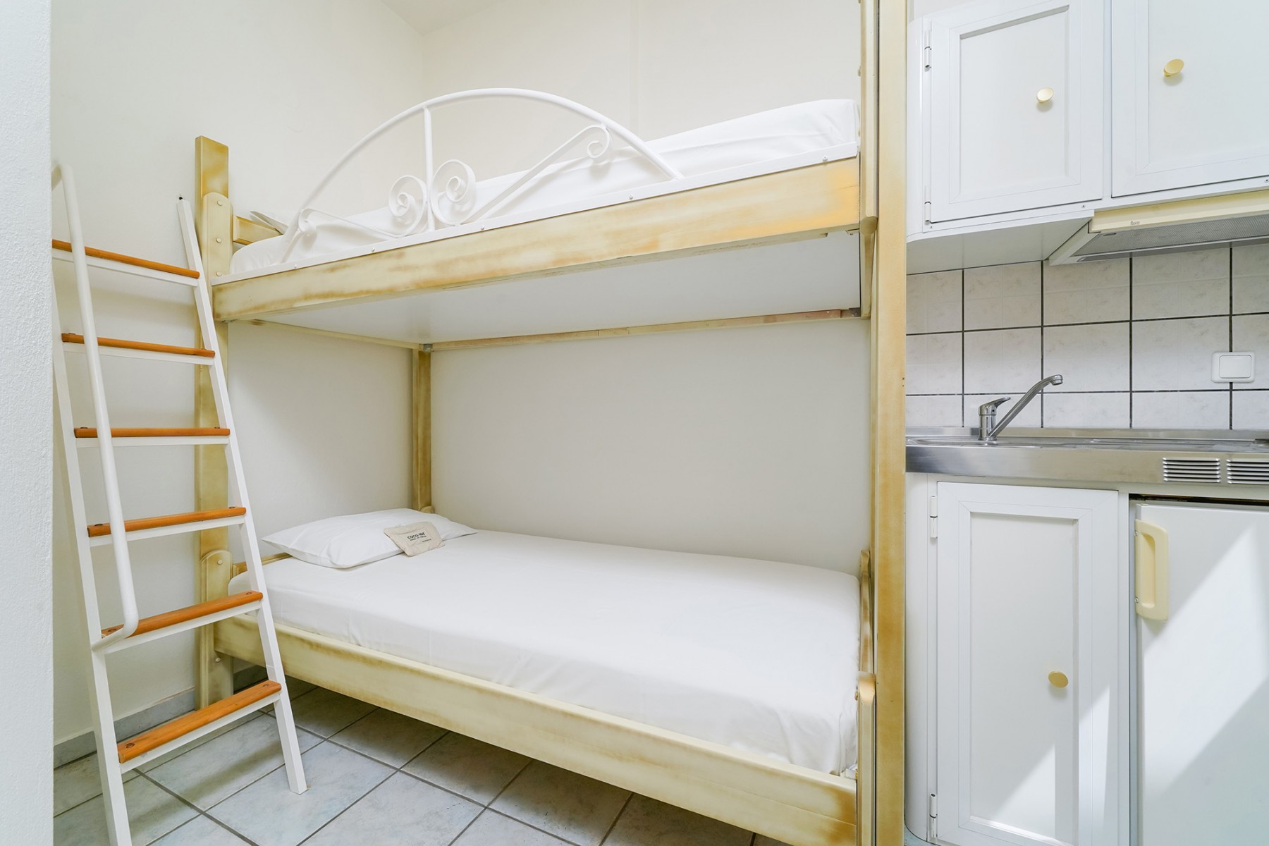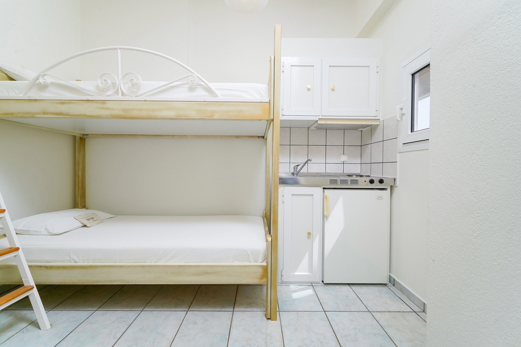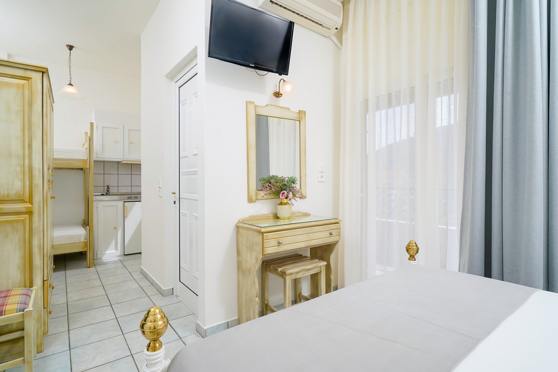 Our studios are spacious and benefit from a double bed and bunk beds which are suitable for both children and adults, a large wardrobe and dressing table complete the furnishings. The kitchenette is fully equipped and the furnished balcony gives you a peaceful place to enjoy your meals with views over our gardens and the impressive Ipsarion mountain range. The bathroom is equipped with a shower, wc and sink.
