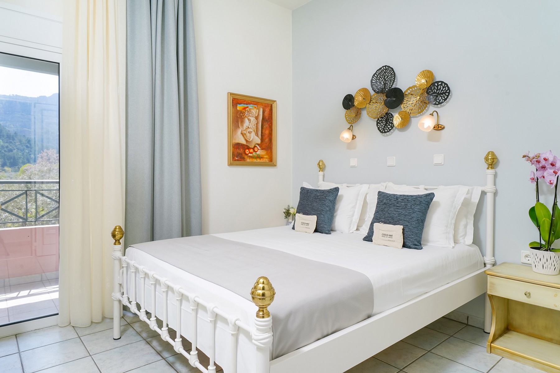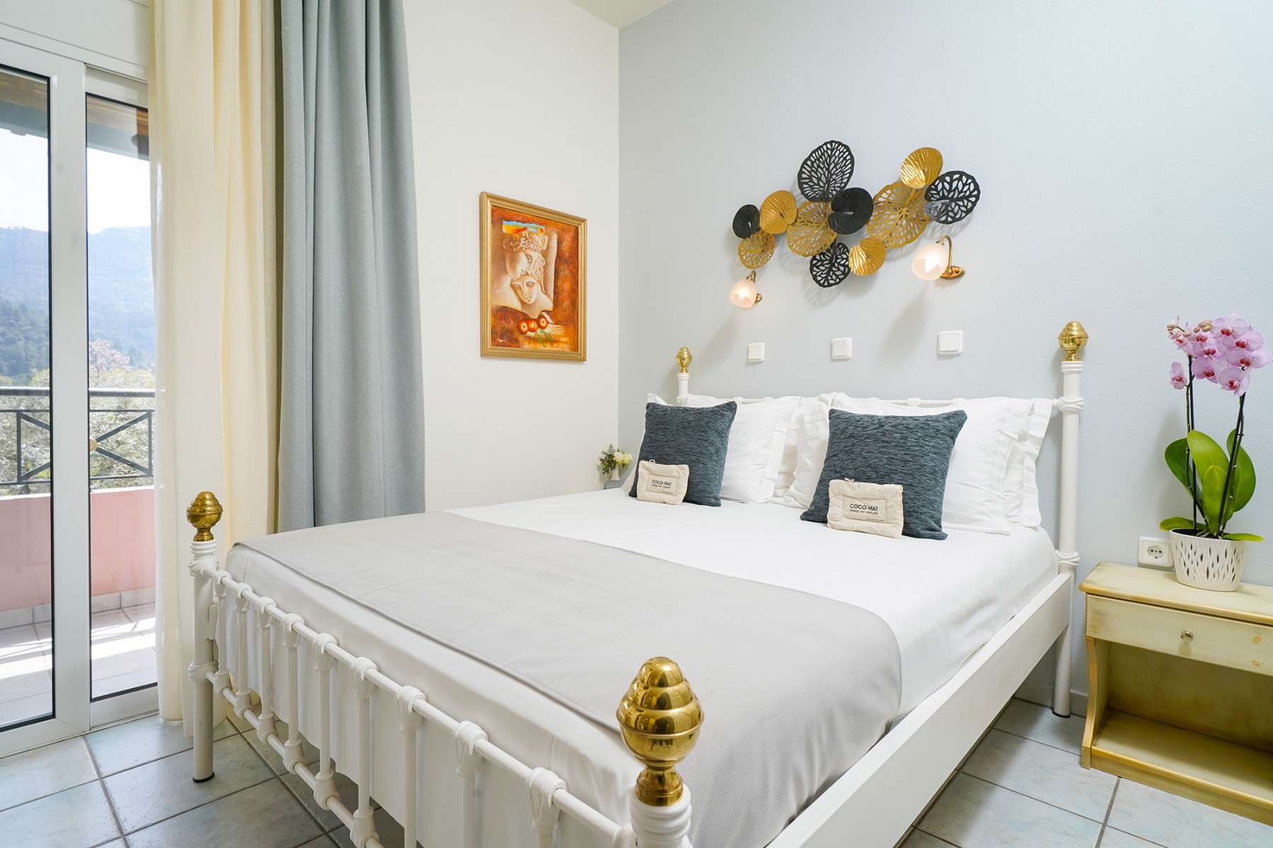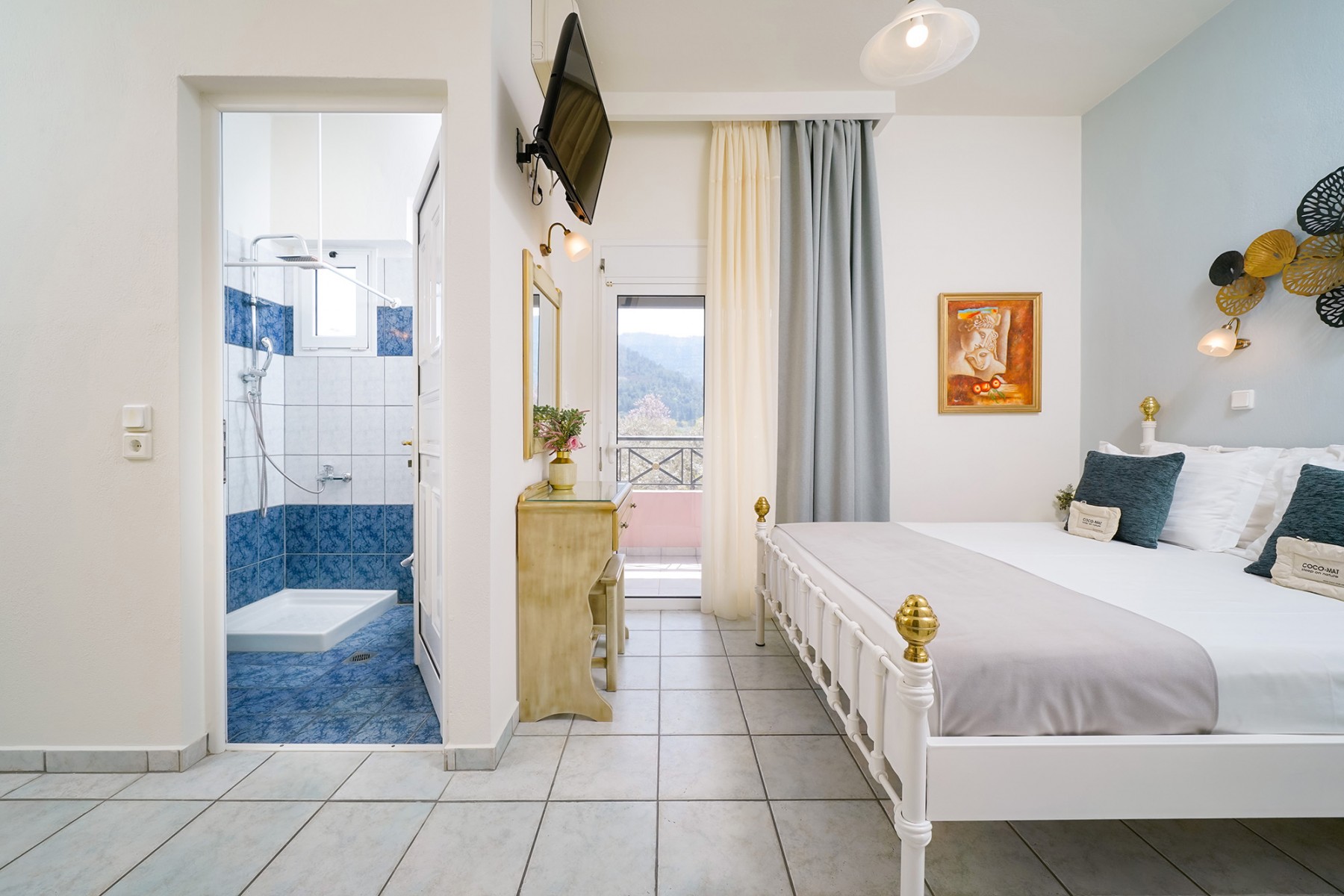 Our studios are spacious and benefit from a double bed and bunk beds which are suitable for both children and adults, a large wardrobe and dressing table complete the furnishings. The kitchenette is fully equipped and the furnished balcony gives you a peaceful place to enjoy your meals with views over our gardens and the impressive Ipsarion mountain range. The bathroom is equipped with a shower, wc and sink.